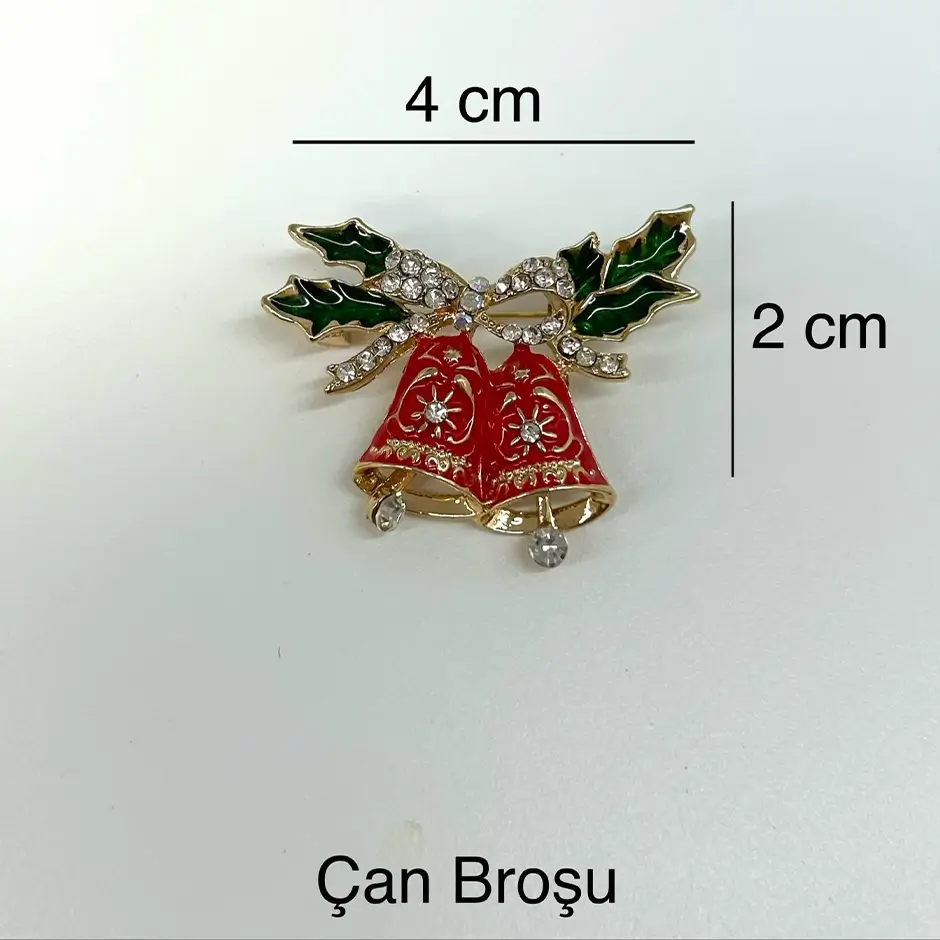 Altın detaylarla tasarlanan kırmızı çan broş, yeşil yaprakları ve ışıltılı taş süslemeleriyle neşeli bir yılbaşı atmosferi sunar. İnce işçiliğiyle dikkat çeken bu tasarım, kombinlere hem sıcak hem canlı bir dokunuş katar. Mevsime özel şıklığıyla öne çıkan etkileyici bir seçimdir. Boyutlar görselle farklılık gösterebilir. Kimyasal ile temas ettirmeyiniz.